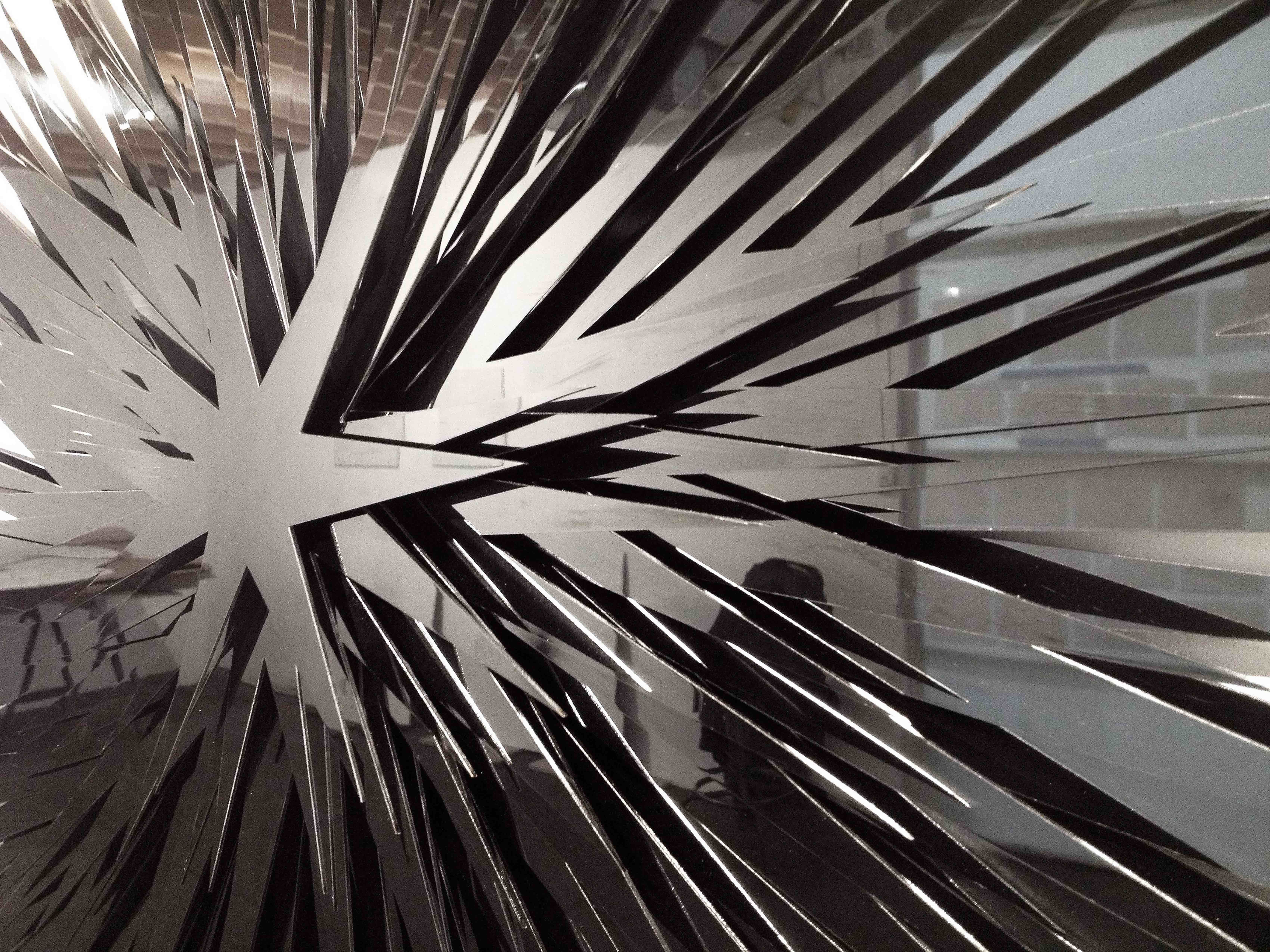 This week we are featuring a dynamic wall sculpture by one of the gallery's contemporary artists, Norman Mooney. Made of mirror polished, blackened stainless steel, Black Sun, gives the impression all at once to be minimal, delicate, dangerous and bursting with energy. This sculpture is one in a series of pieces in which the artist examines the natural world around us. The Flower, Seed, Stars, and Sun series all suggest the presence of nature in man-made structures and provoke a thoughtful reflection about our own existence in a complex world.